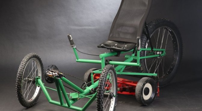 Qui cominciamo dalla più futuristica: il Mow Ciclo, un prototipo realizzato al momento in un solo esemplare nel New Hampshire da un creativo costruttore di biciclette, Ted Wojcik, e da suo figlio Cody, ingegnere meccanico. Guardate un po’ cosa si sono inventati questi due: praticamente è il sostituto eco-friendly dei tradizionali trattorini tosaerba, di cui conserva il comfort di seduta, riducendo però a zero i consumi!