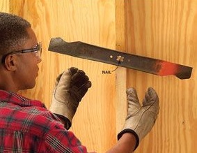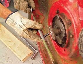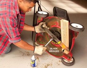 Uno dei metodi più semplici per bloccare la lama è quello di inserire un blocco resistente di legno fra la lama e la scocca del tosaerba, così da bloccarne la rotazione mentre viene svitato il bullone.
