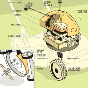 Appoggiate il tosaerba su un fianco, importante che il carburatore sia rivolto verso l’alto per evitare di danneggiare i filtri dell’aria o travasi imprevedibili di olio nel carburatore.
