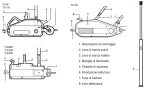 La forza esercitata dall’operatore è trasmessa alle leve di manovra (leva di marcia avanti o leva di marcia indietro) da una leva telescopica amovibile. L’apparecchio è provvisto di un organo di ancoraggio, gancio o perno secondo i modelli, che permette il fissaggio rapido a qualsiasi punto fisso di resistenza sufficiente.