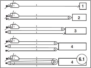 La portata del TIRFOR può essere considerevolmente aumentata mantenendo invariato lo sforzo dell’operatore con l’impiego di carrucole di rinvio (vedere gli esempi di schemi Fig. 6.1 e 6.2).