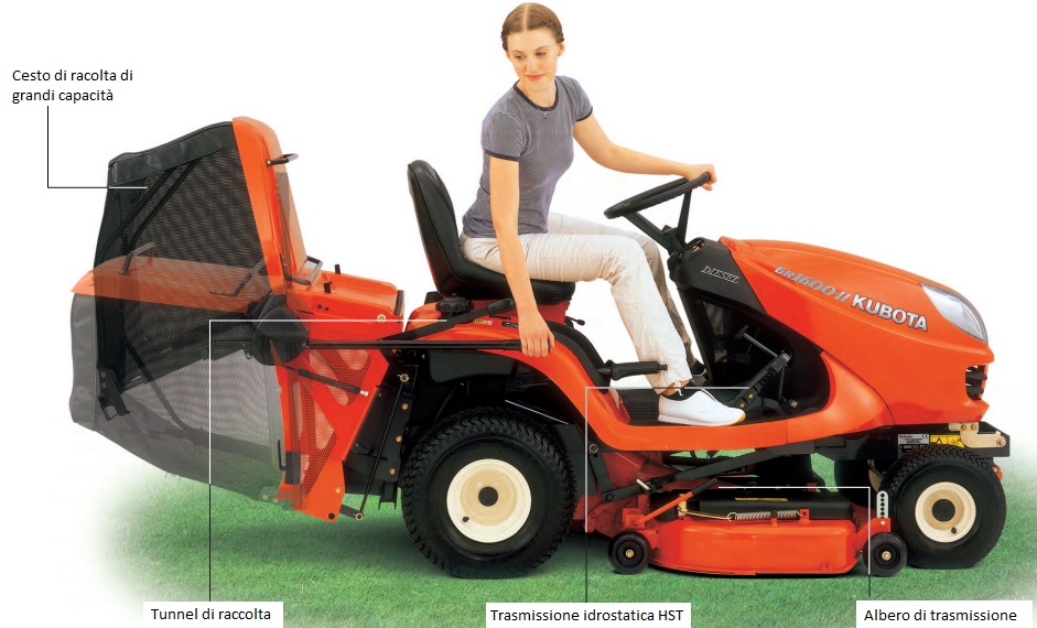 Il Trattorino Kubota GR1600 II è il trattorino rasaerba diesel tra i migliori nel segmento con scarico posteriore di raccolta, maneggevole e robusto è riconosciuto per la sua qualità di taglio e di raccolta in qualsiasi condizione.