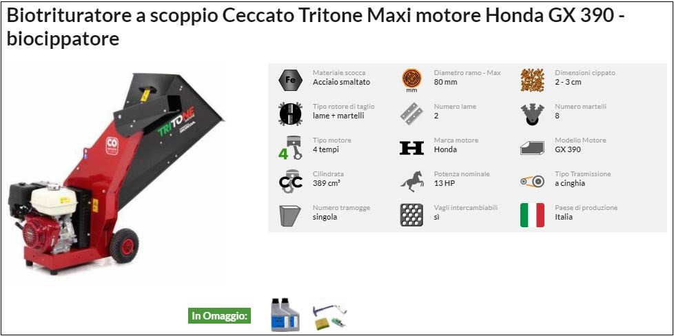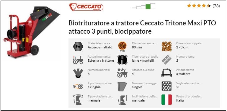 Prezzo indicativo di mercato del biotrituratore Ceccato Tritone Maxi: da 1700 a 1900 € a seconda del modello (elettrico, a scoppio o a trattore).