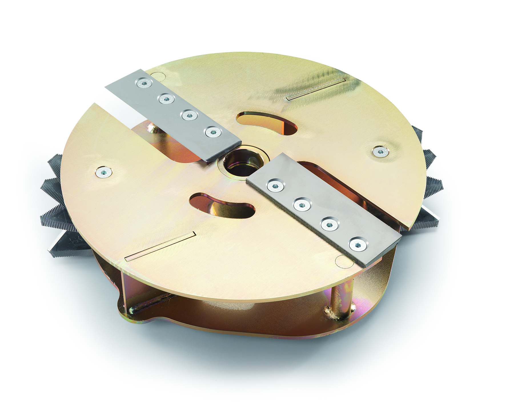 Il rotore centrale è dotato di 2 lame di taglio, che assieme alle 2 contro lame, servono ad effettuare la prelavorazione del materiale tagliandolo in frammenti più grossolani che poi vengono lavorati dalle 8 lame sminuzzatrici (martelli) in acciaio temprato. Questi martelli girando ad alta velocità effettuano una operazione a centrifuga sminuzzando tutto il materiale in piccole dimensioni.