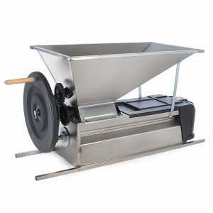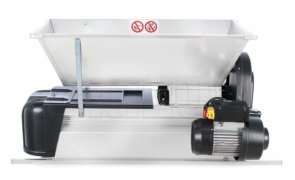 Questa pigiatrice elettrica è composta da una tramoggia completamente in acciaio smaltato e sorretta da una struttura robusta anch’essa in acciaio.