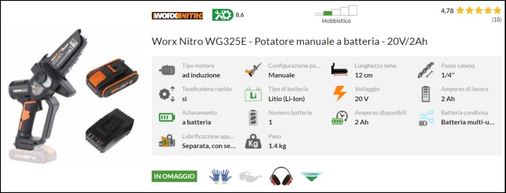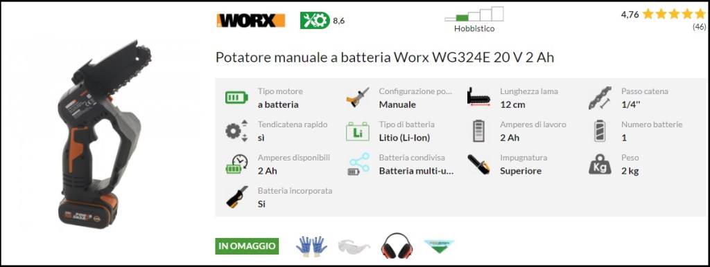 Il potatore a batteria Worx WG324E è apprezzato per la sua facilità d’uso e leggerezza, rendendolo ideale per tagliare rami di piccole e medie dimensioni. Recensioni online evidenziano la sua potenza adeguata e la durata della batteria che permette di lavorare senza interruzioni.