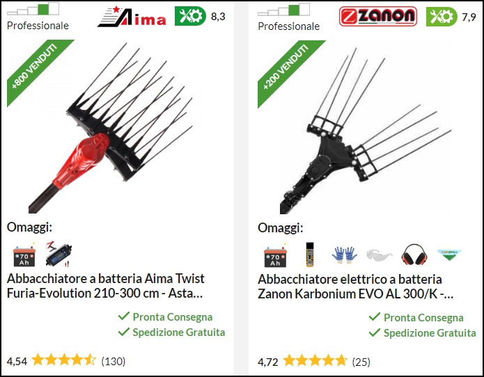 In ordine di prezzo vi proponiamo quelli che, secondo noi, sono i migliori abbacchiatori elettrici a batteria con movimento orizzontale considerando il fattore qualità / prezzo. Cliccando sulla foto con le caratteristiche tecniche si entra nel sito del rivenditore con il prezzo più vantaggioso per quel modello di abbacchiatore.
