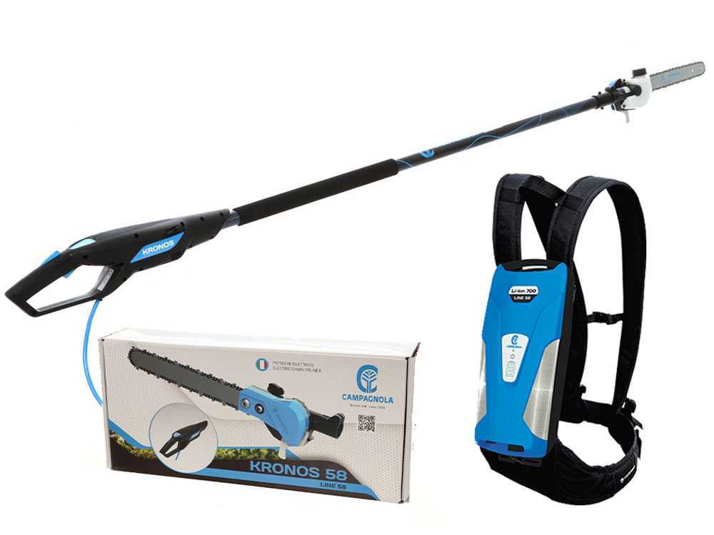 Il potatore a batteria Campagnola KRONOS 58 è un potatore elettrico a catena utilizzabile in connessione con tre dimensioni di asta fissa, raggiungendo una lunghezza totale di 190 o 230 cm. Un selettore permette di scegliere fra 6 velocità della catena. Kronos 58 può anche essere alimentato dalla batteria LI ION 700, inserita nel comodo zaino. Con ogni ricarica garantisce circa 600 tagli di 10 cm di diametro, che corrispondono approssimatamene ad una giornata di lavoro. La sua batteria è la stessa che può alimentare gli abbacchiatori della LINE 58.
