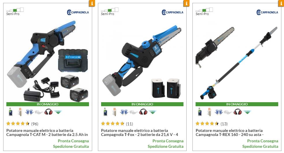 La gamma di potatori a batteria Campagnola è composta da 3 potatori a batteria della linea Green Line e un potatore a batteria della linea Professional Line.