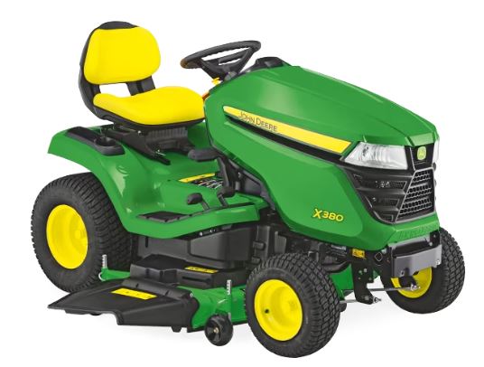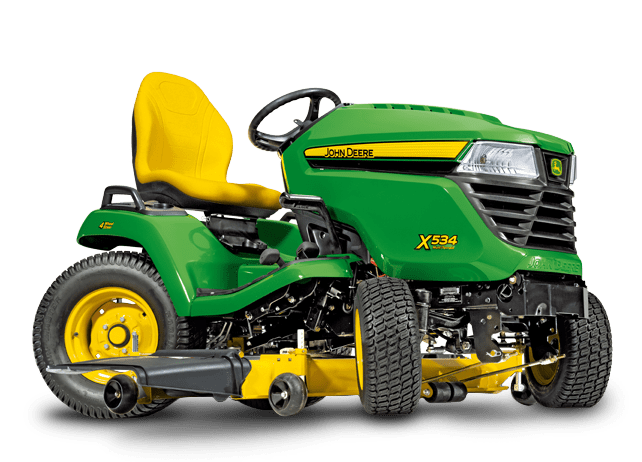 Trattorino tosaerba John Deere X534 con motore benzina bicilindrico da 16,4 kW e larghezza di taglio da 122 o 137 cm.
